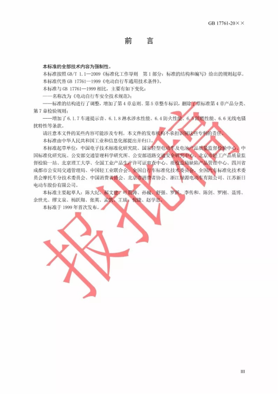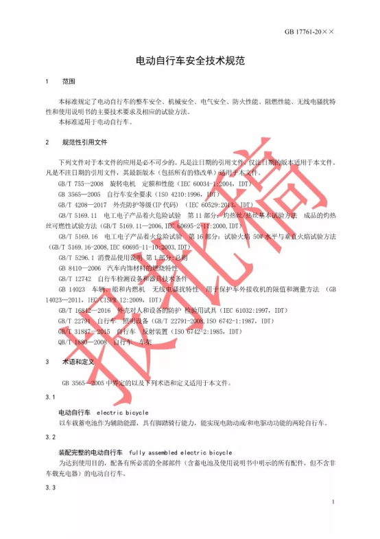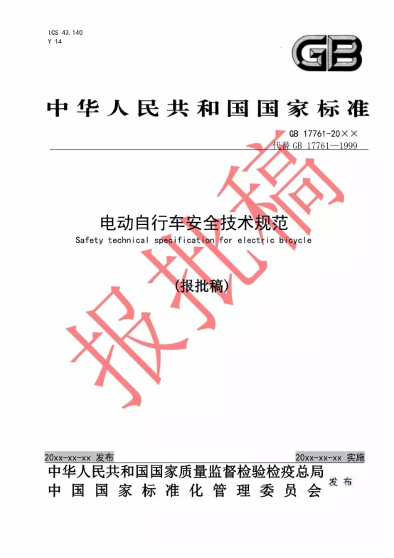 按照国务院标准化工作改革的精神,工业和信息化部、公安部、工商总局、质检总局(国家标准委)四部门,组织电动自行车相关科研机构、检测机构、生产企业、高等院校、行业组织、消费者组织等方面的专家成立工作组,开展《电动自行车通用技术条件》(GB17761-1999)强制性国家标准修订工作,修订后的标准名称为《电动自行车安全技术规范》。2018年1月16日起,该标准报批稿在工业和信息化部、国家标准委网站面向全社会公示30天。