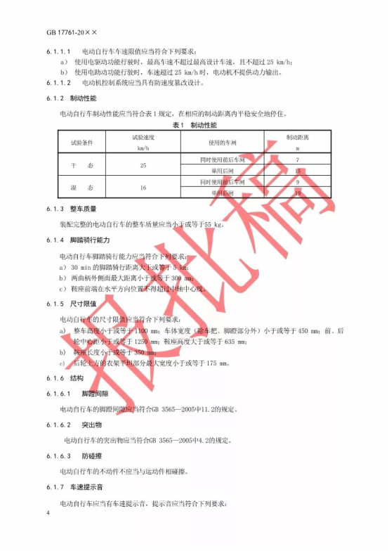 工业和信息化部、公安部、工商总局、质检总局(国家标准委)四部门始终坚持从经济社会发展大局出发,立足于引领我国电动自行车行业高质量发展,以“三确保一坚持”为根本原则,即确保消费者的生命财产安全,确保所有道路交通参与方的共同利益最大化,确保广大消费者基本的出行需求,坚持电动自行车的非机动车属性,指导标准修订工作。新标准全面提升了电动自行车的安全性能,由原来的部分条款强制改为全文强制,增加了防篡改、防火性能、阻燃性能、充电器保护等技术指标,调整完善了车速限值、整车质量、脚踏骑行能力等技术指标。其中,最高车速由20km/h调整为25km/h,整车质量(含电池)由40kg调整为55kg,电机功率由240W调整为400W,并对具有脚踏骑行功能进行了强制性规定。