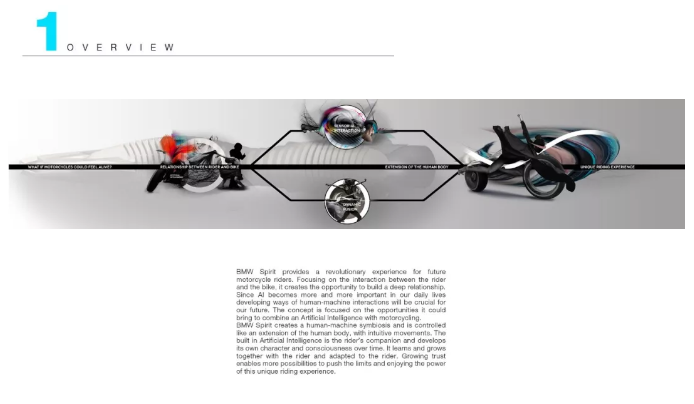 BMW Spirit为未来的摩托车骑手提供革命性的体验。专注于骑手和自行车之间的互动,它创造了建立深厚关系的机会。由于人工智能在我们的日常生活中变得越来越重要,人机交互的方式对我们的未来至关重要。该概念侧重于将人工智能与摩托车结合起来所带来的机遇。BMW Spirit创造了一种人机共生,并且通过直观的动作被控制为人体的延伸。内置的人工智能是骑手的伴侣,随着时间的推移发展自己的性格和意识。它与骑手一起学习和成长并适应骑手。